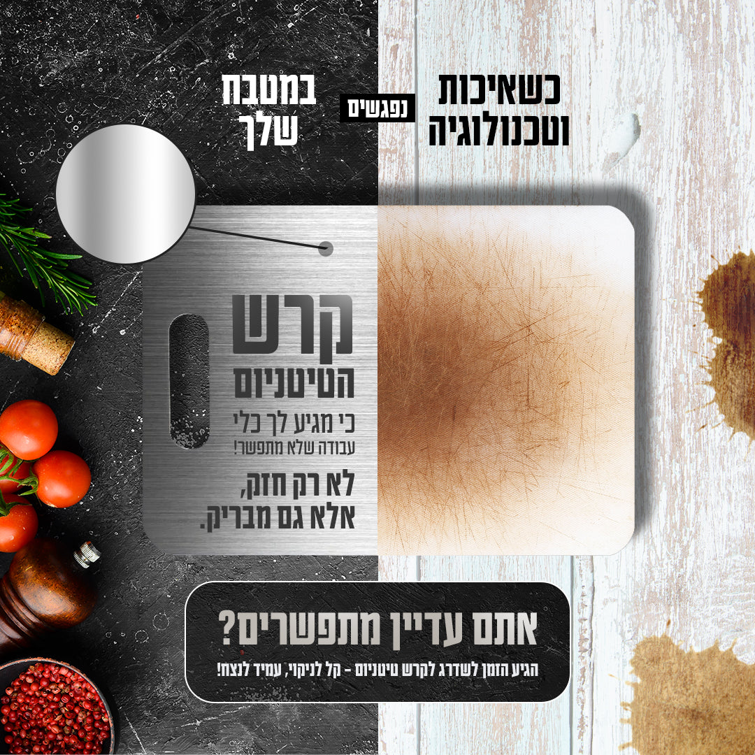מאז שקיבלתי את קרש טיטניום, הכנת הארוחות הפכה להרבה יותר כיפית. המשטח יציב ומדויק, החיתוכים יוצאים מושלמים, והוא כל כך יפה שכולם שואלים אותי מאיפה הקרש הזה.
